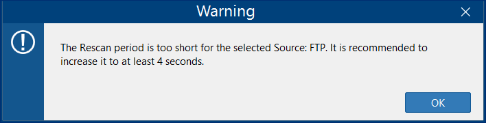 When saving your Hot Folder settings, you may receive a warning advising you to set the rescan interval to 4 seconds or more. This is required because the FTP protocol operates relatively slowly. Additionally, if FolderMill runs in multi-tasking mode, a shorter interval could spawn multiple simultaneous connections, which may cause collisions with the FTP server.